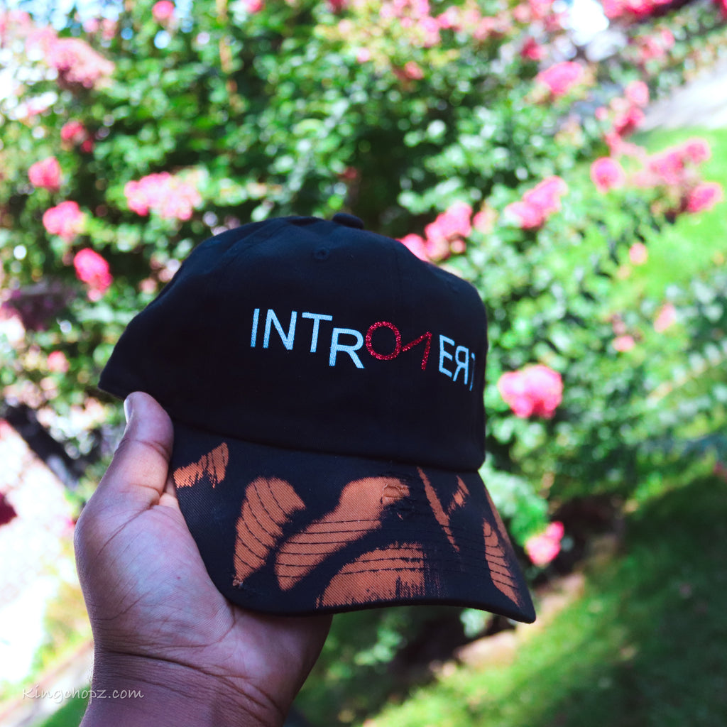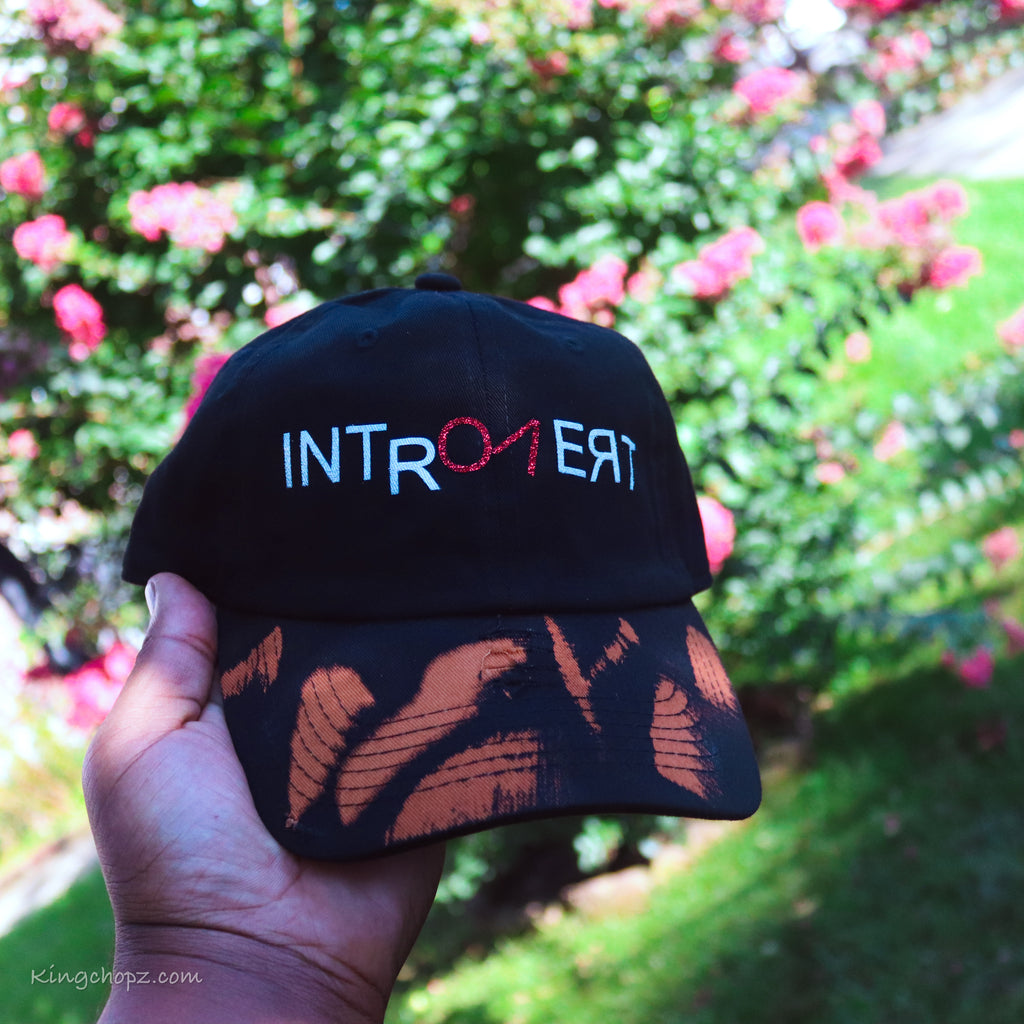 - Weißer und glitzernder roter Satz mit der Aufschrift „Introvert“ in der Mitte des Hutes