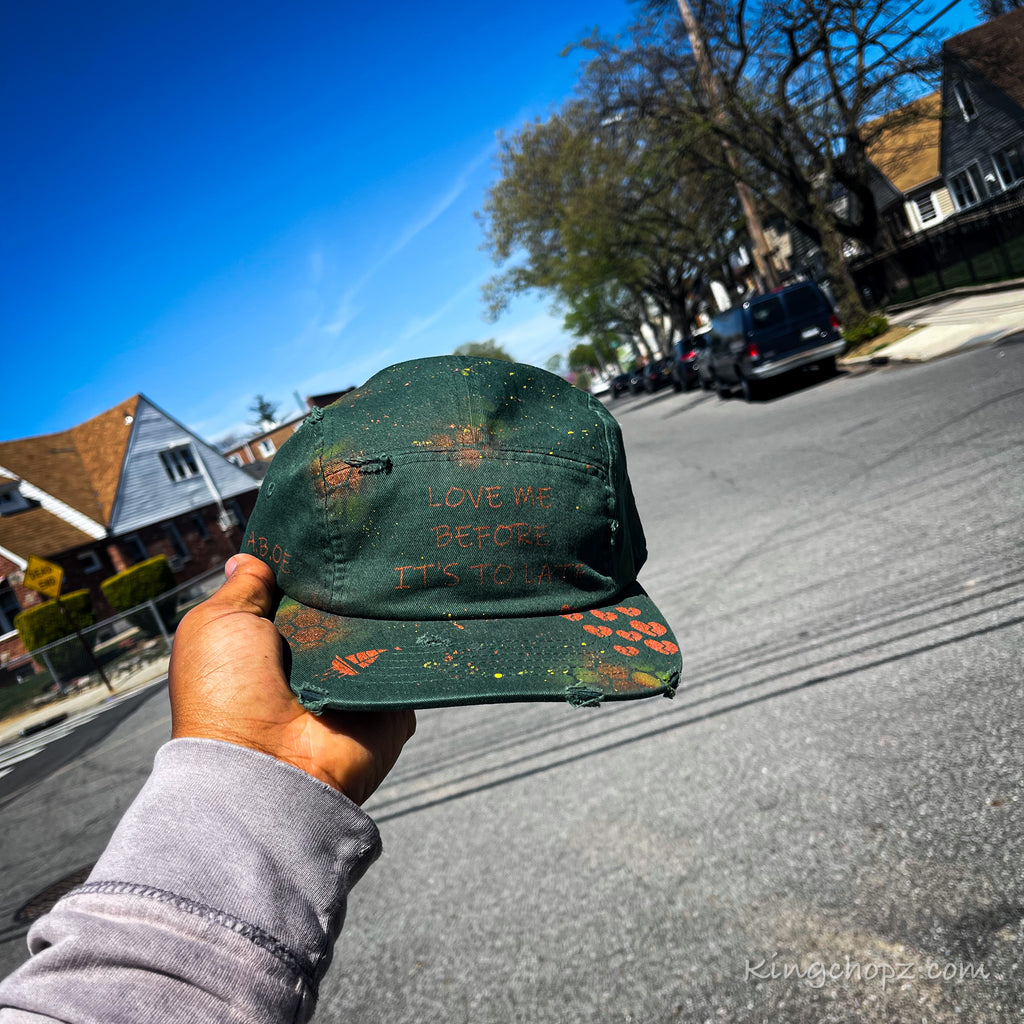 - Yellow and copper paint splatter effect all over the hat