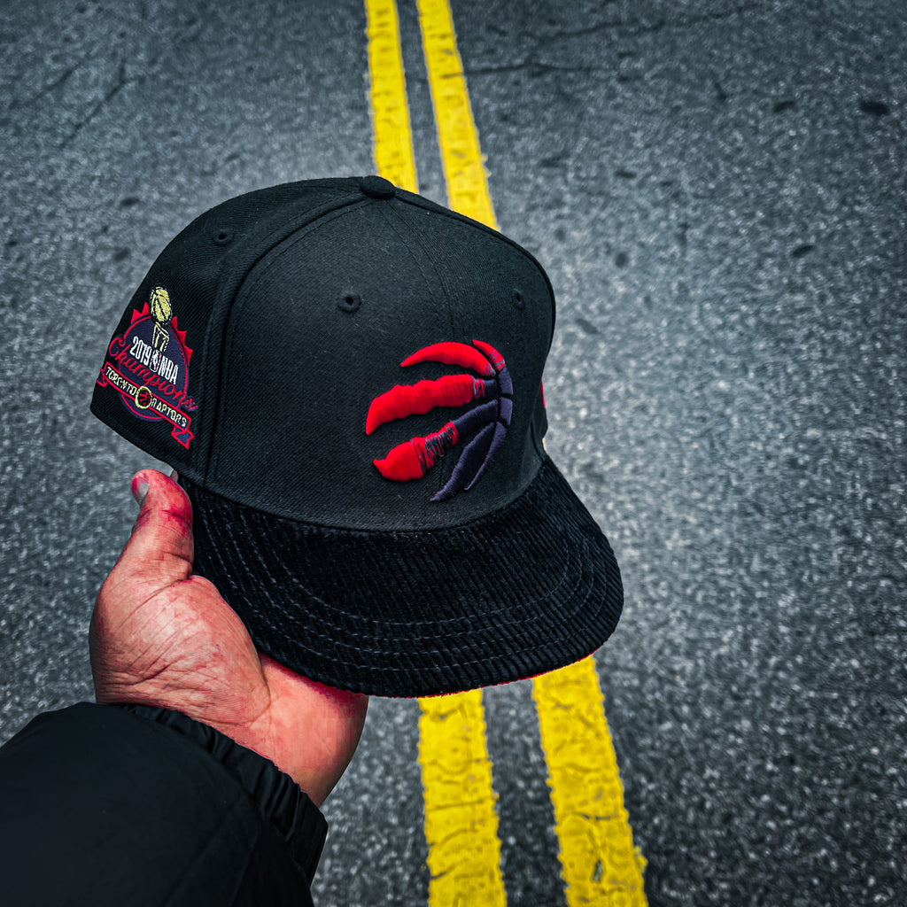 - Red , purple, black, white and gold 2019 NBA Championship patch on right side of hat