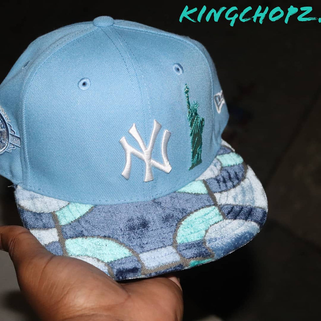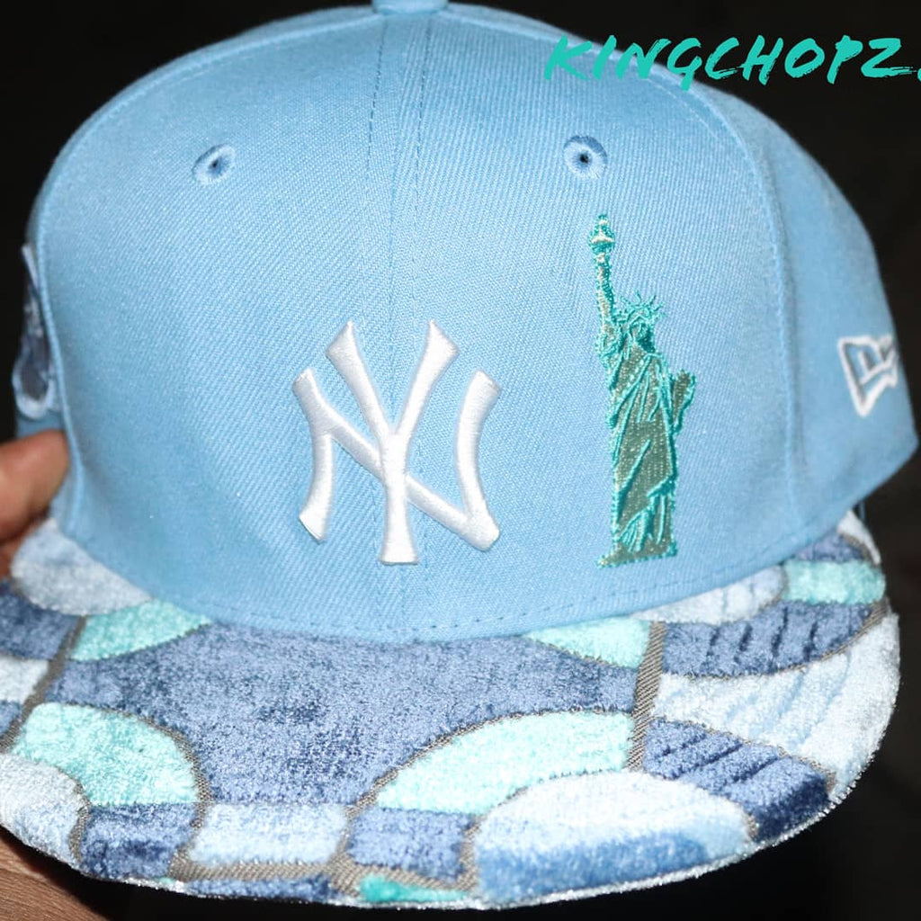 Nada dice verano como un sombrero azul bebé, pero si es un sombrero personalizado por chopz, definitivamente te sentirás y te verás genial. - Gorra snapback New Era New York Yankees de 100 años en azul bebé (talla única para la mayoría) - Símbolo de los New York Yankees bordado en blanco en el centro de la gorra, con el símbolo de New Era bordado en blanco en el lado izquierdo de la gorra - Estatua de verde bosque de Parche bordado Liberty ubicado en el costado del símbolo de los 2 yankees blancos - Blanco, azul bebé y un toque de plata Parche bordado del aniversario de los Yankees de Nueva York de 100 años en el lado derecho del sombrero - Terciopelo multicolor de alta calidad (aguamarina, azul bebé ,azul real) en la parte superior del borde con estampado de terciopelo de cocodrilo plateado/gris en la parte inferior
