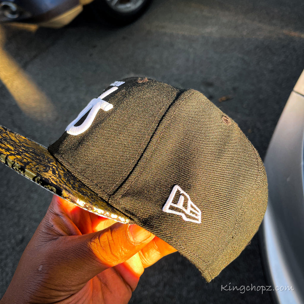 This unique addition is a must-have for your collection. Fashioned with hand-sewn vintage two-tone gold fabric on top and metallic silver material on the bottom, this custom piece is truly one-of-a-kind.