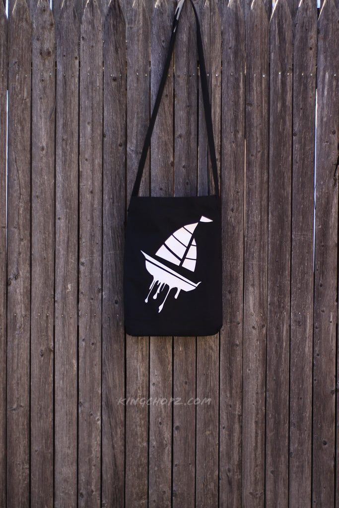 - Black medium sling tote bag with white phrase "GET OUT YOUR FEELINGS AND GET A BAG"on front and Kingchopz boat logo on back of bag .