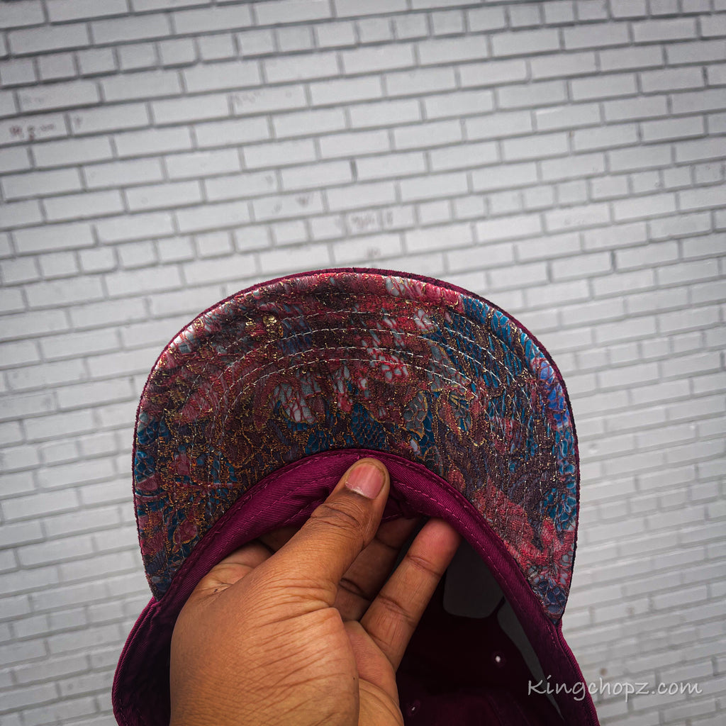 - Metallic Burgundy alligator velvet material on top with a stunning multicolor floral print on bottom